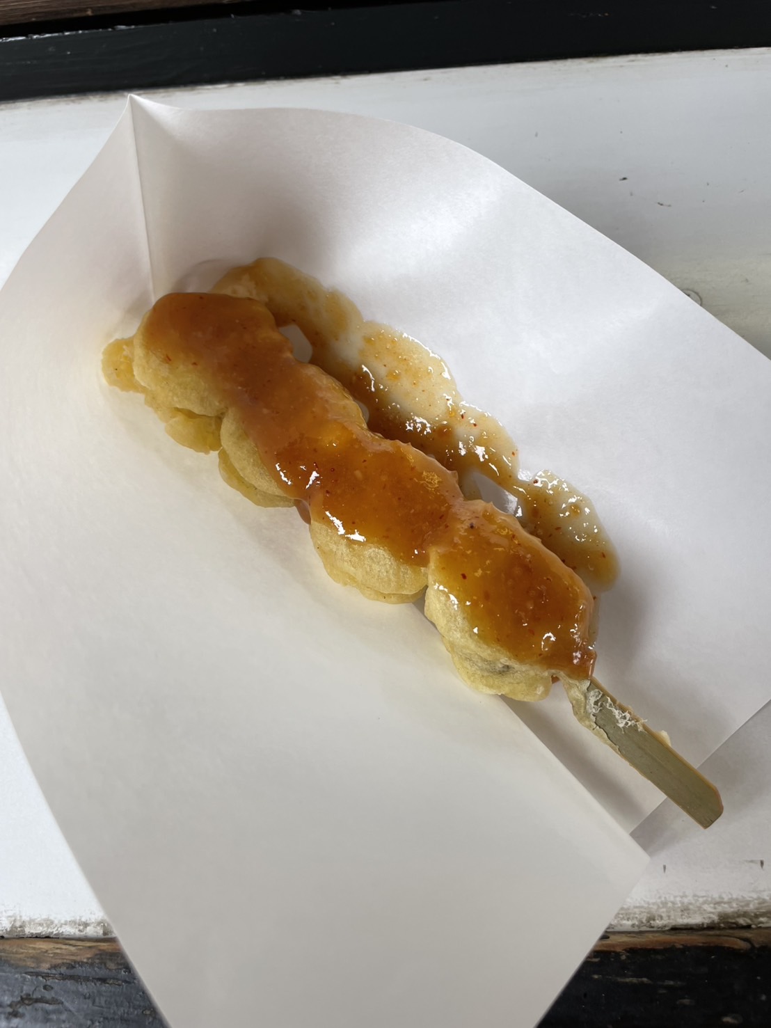 ふかしたジャガイモの天ぷらに、甘めの味噌ダレをかけたB級グルメで、昨年から気になっていた一品。食べてみると、外はサクッと、中はホクホク。甘じょっぱいタレがちょうどよく絡み、とても美味しかったです。